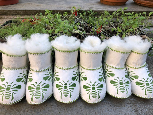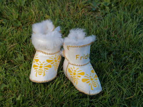 Denne modellen blir oftest sydd av mjuke lammeskinn av norsk kvit sau. Noen lages også av mjuke lammeskinn av norsk pelssau, gotlandsfår eller leicesterfår. Klaffetøflene er sydd sammen med knapphullssting med perlegarn DMC 5 i farge som passer til dekoren. De kan også sys sammen av kvit lintråd.